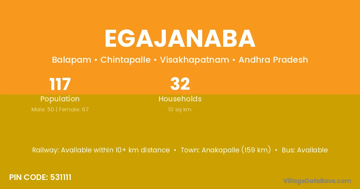 Anakapalle (159 km) is the nearest town to Egajanaba village for major economic activities and is located approximately 159 km away.