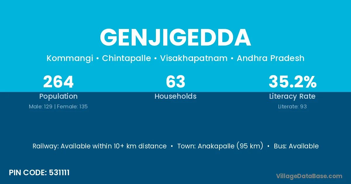 Anakapalle (95 km) is the nearest town to Genjigedda village for major economic activities and is located approximately 95 km away.