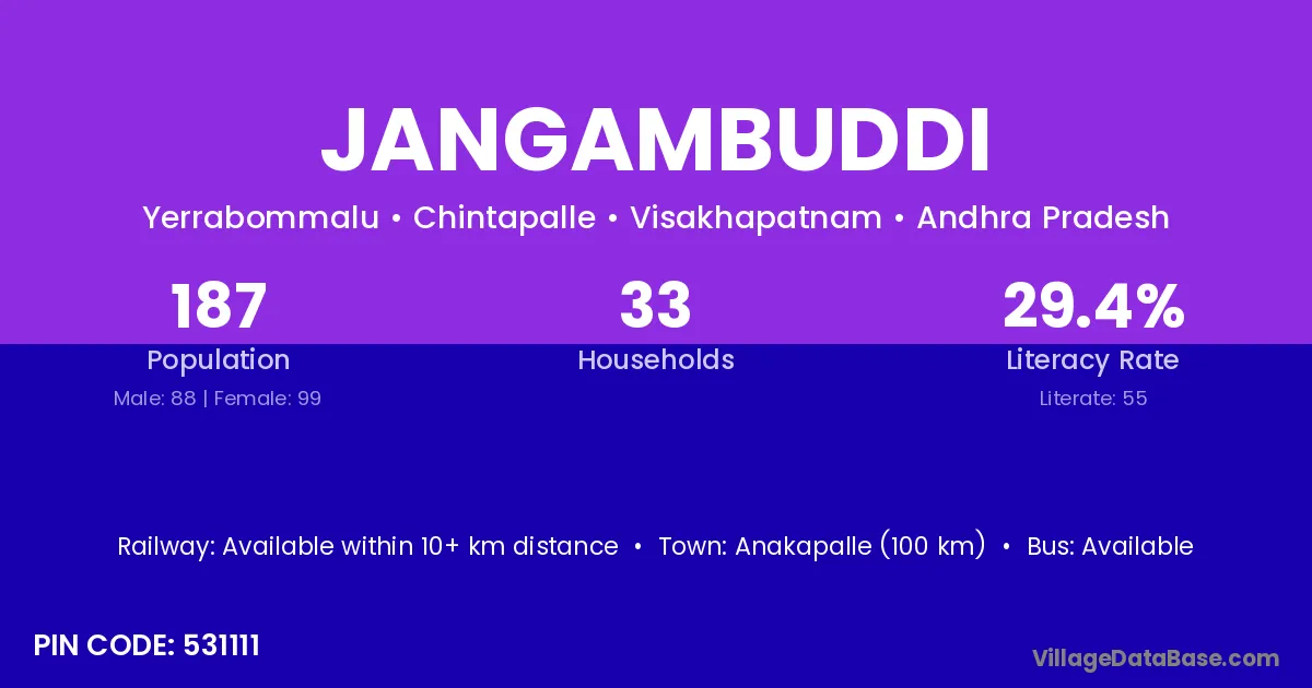 Anakapalle (100 km) is the nearest town to Jangambuddi village for major economic activities and is located approximately 100 km away.