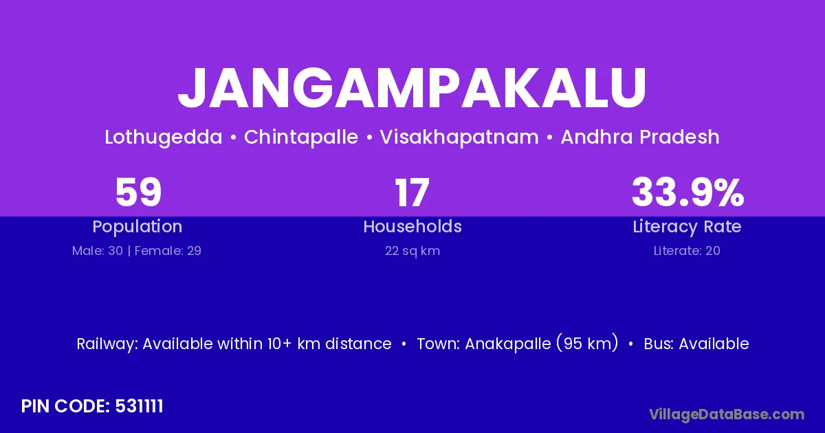 Jangampakalu village has a total population of 59 people, of which 30 are males and 29 are females.