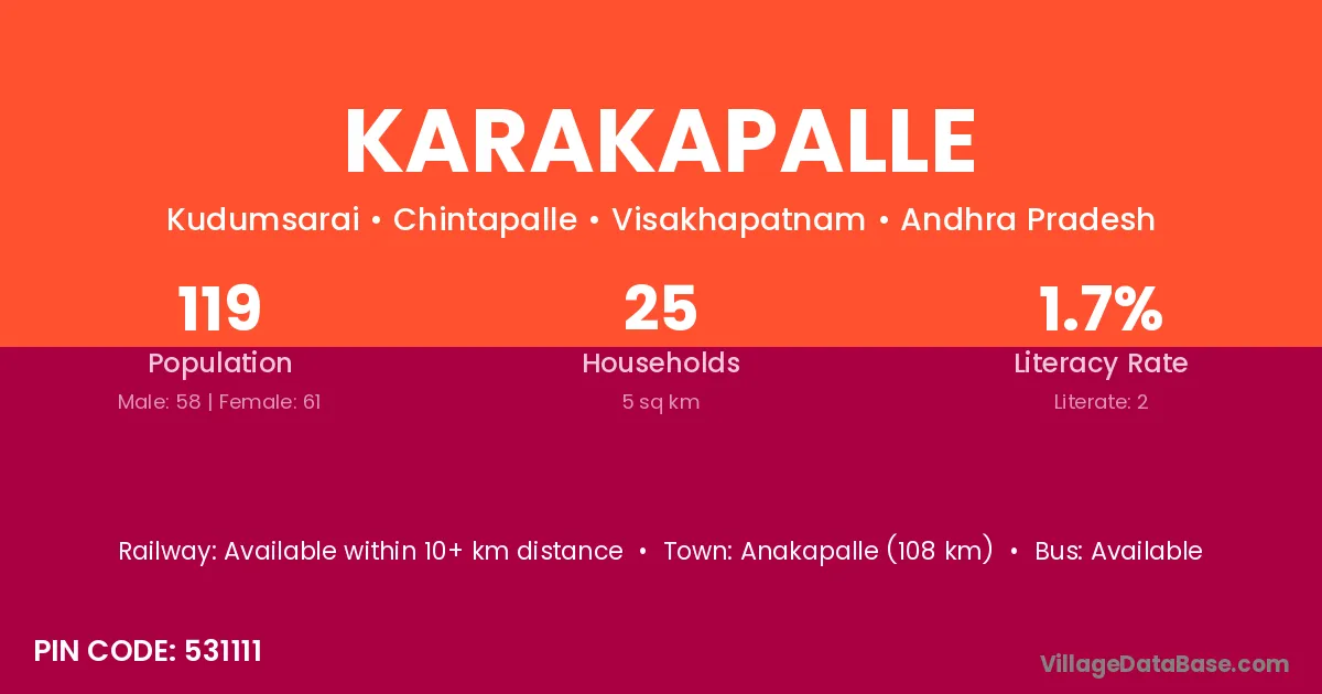 Karakapalle village has a total population of 119 people, of which 58 are males and 61 are females.