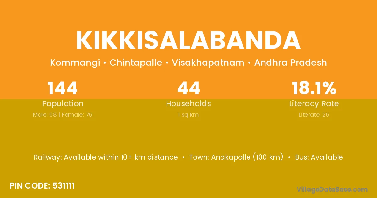 Kikkisalabanda village has a total population of 144 people, of which 68 are males and 76 are females.
