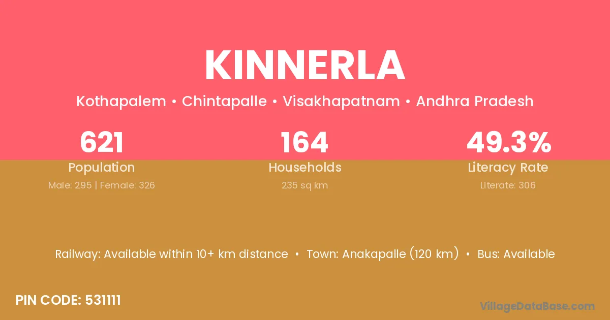 Anakapalle (120 km) is the nearest town to Kinnerla village for major economic activities and is located approximately 120 km away.