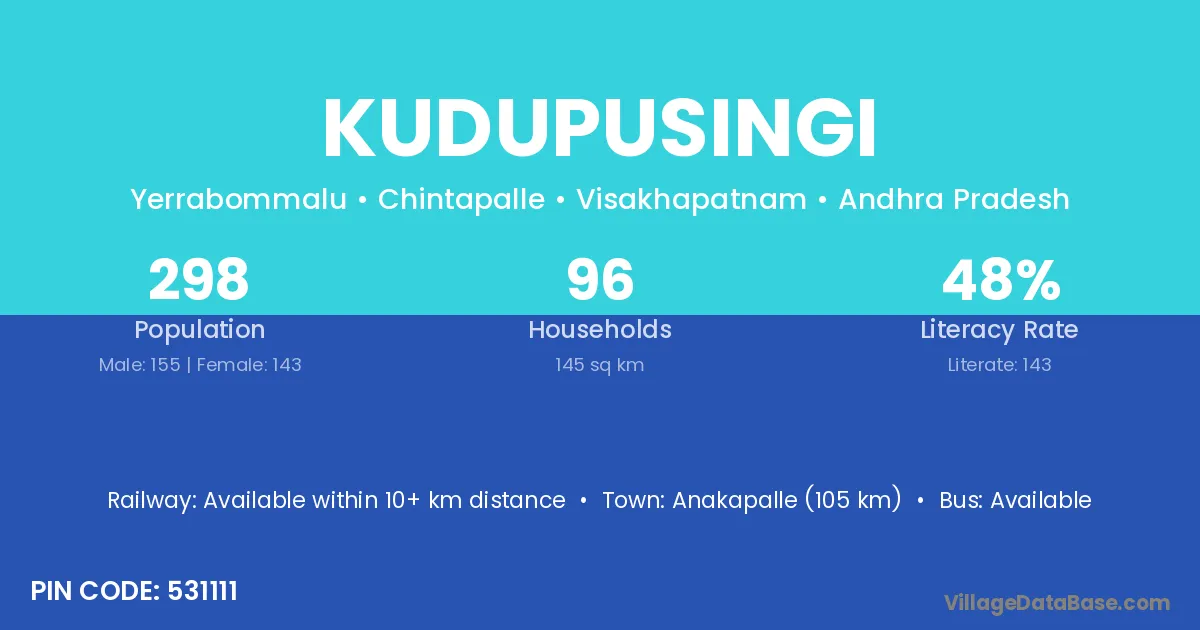 Anakapalle (105 km) is the nearest town to Kudupusingi village for major economic activities and is located approximately 105 km away.