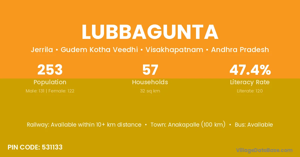 Anakapalle (95 km) is the nearest town to Lubbagunta village for major economic activities and is located approximately 95 km away.