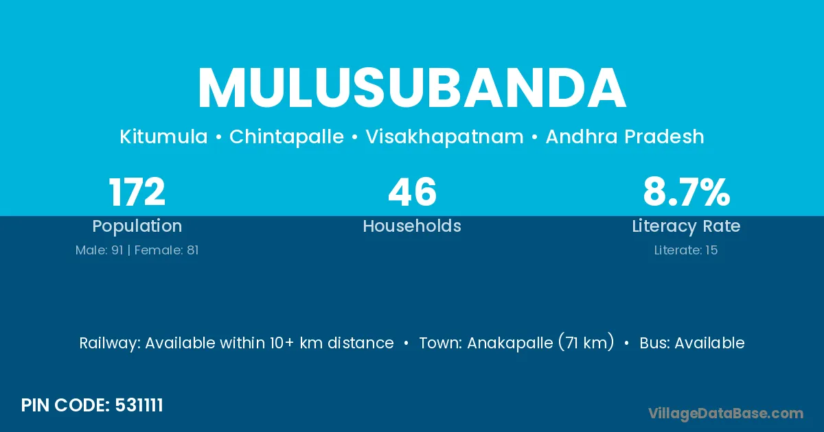 Anakapalle (71 km) is the nearest town to Mulusubanda village for major economic activities and is located approximately 71 km away.