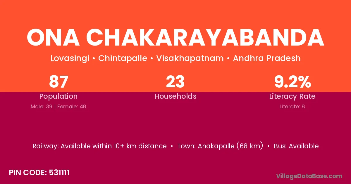Anakapalle (68 km) is the nearest town to Ona Chakarayabanda village for major economic activities and is located approximately 68 km away.