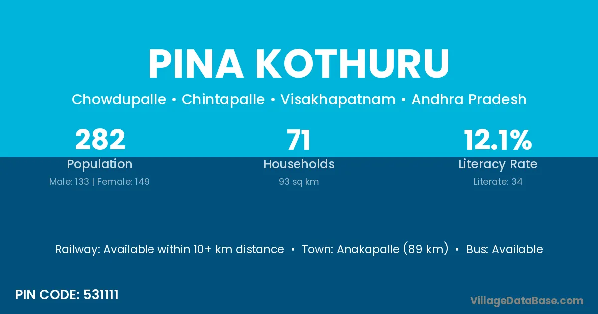 Anakapalle (89 km) is the nearest town to Pina Kothuru village for major economic activities and is located approximately 89 km away.