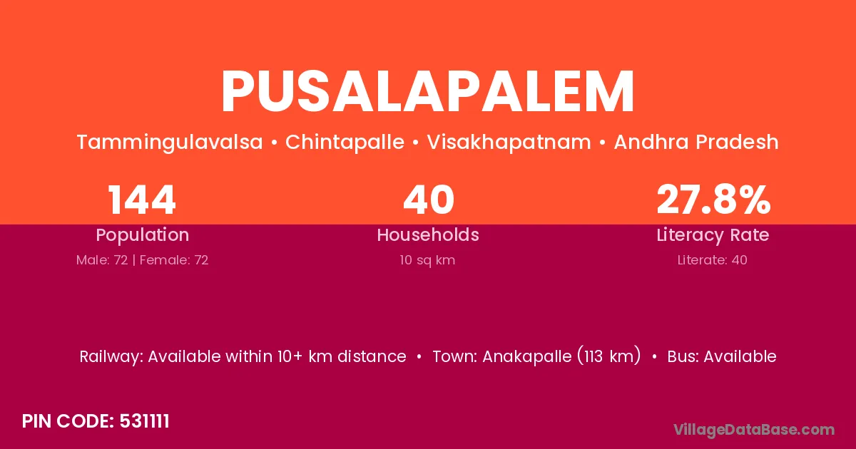 Pusalapalem village has a total population of 144 people, of which 72 are males and 72 are females.