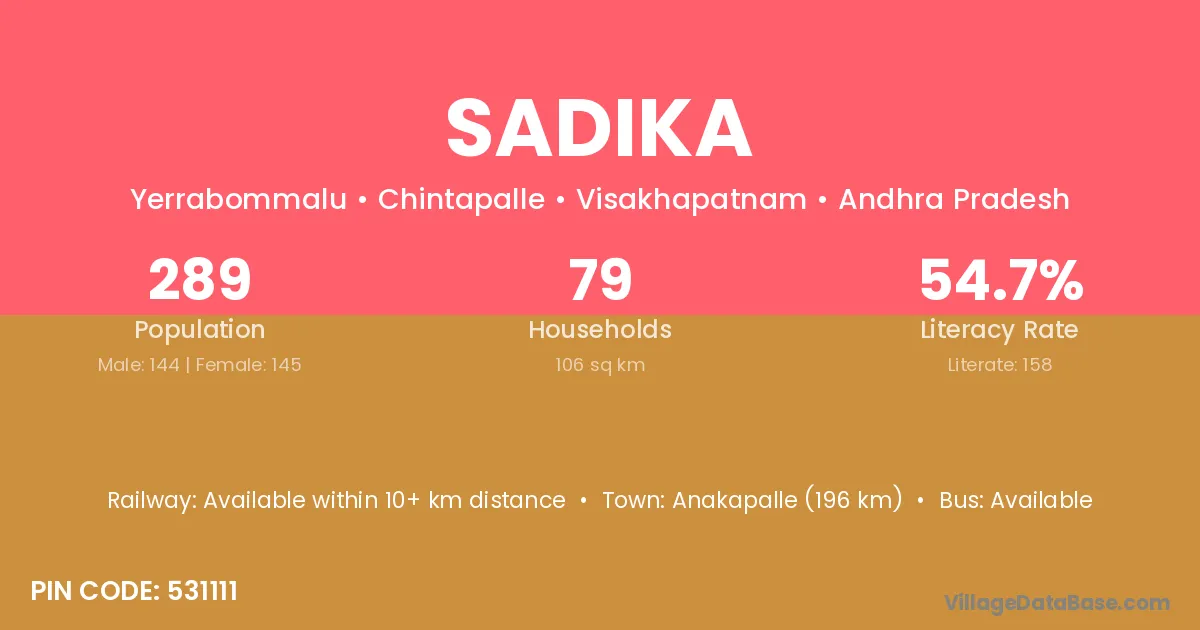 Anakapalle (196 km) is the nearest town to Sadika village for major economic activities and is located approximately 196 km away.