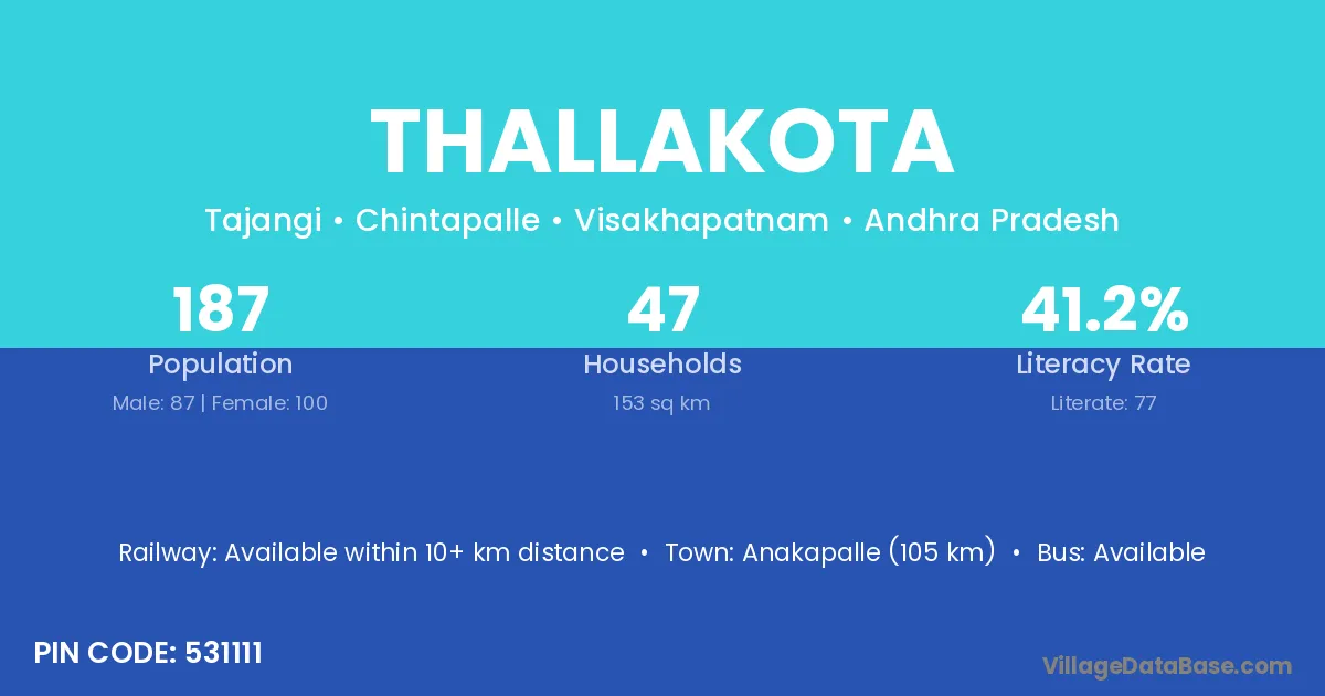 Anakapalle (105 km) is the nearest town to Thallakota village for major economic activities and is located approximately 105 km away.