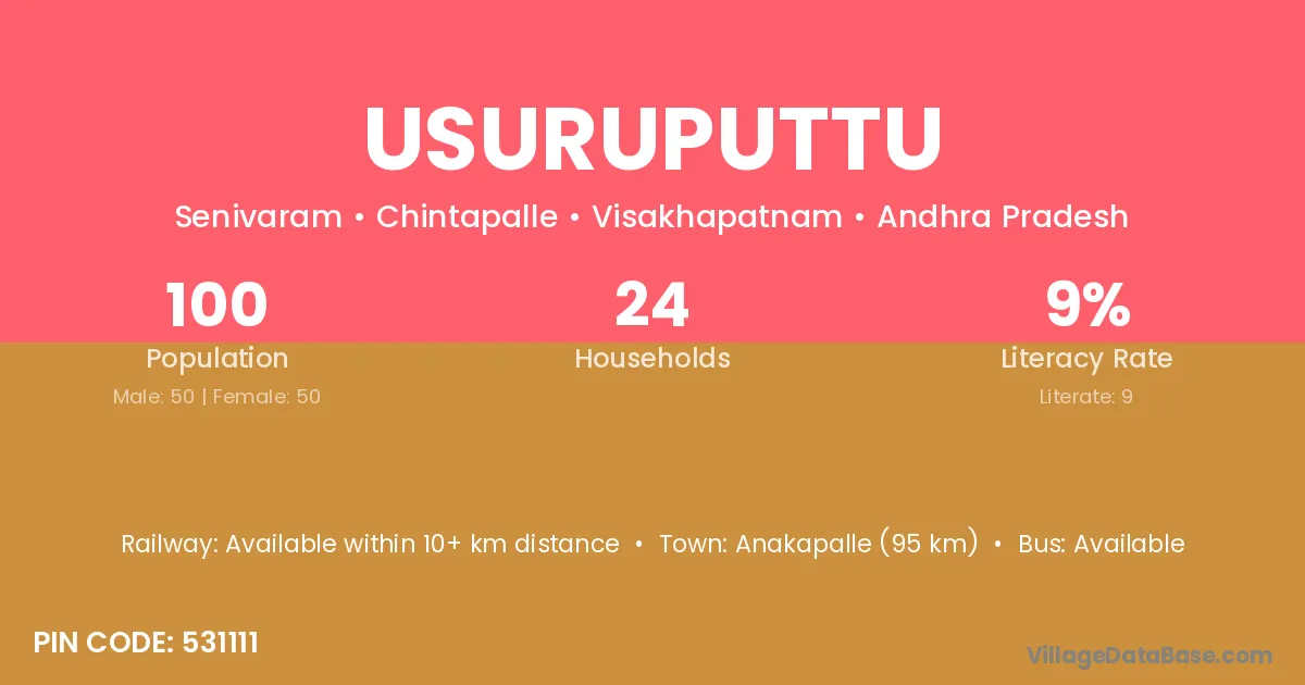 Usuruputtu village has a total population of 100 people, of which 50 are males and 50 are females.
