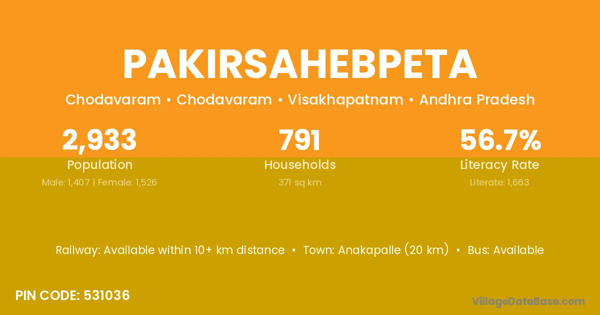 Anakapalle (20 km) is the nearest town to Pakirsahebpeta village for major economic activities and is located approximately 20 km away.