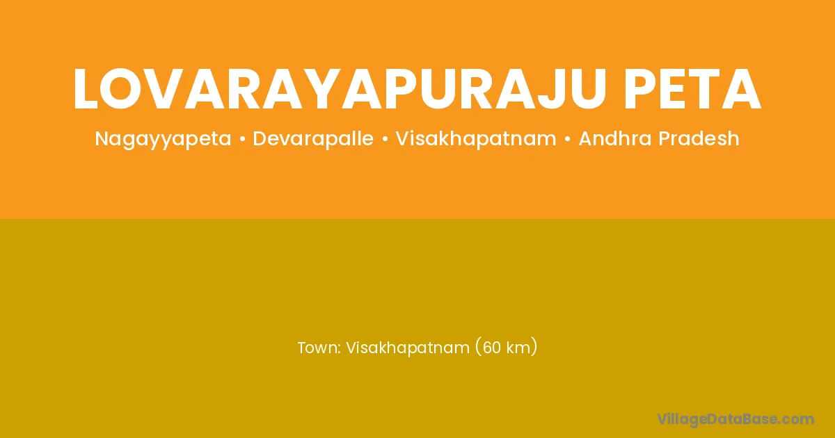 Visakhapatnam (60 km) is the nearest town to Lovarayapuraju Peta village for major economic activities and is located approximately 60 km away.