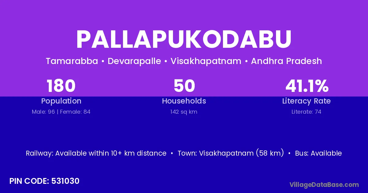 Pallapukodabu village has a total population of 180 people, of which 96 are males and 84 are females.