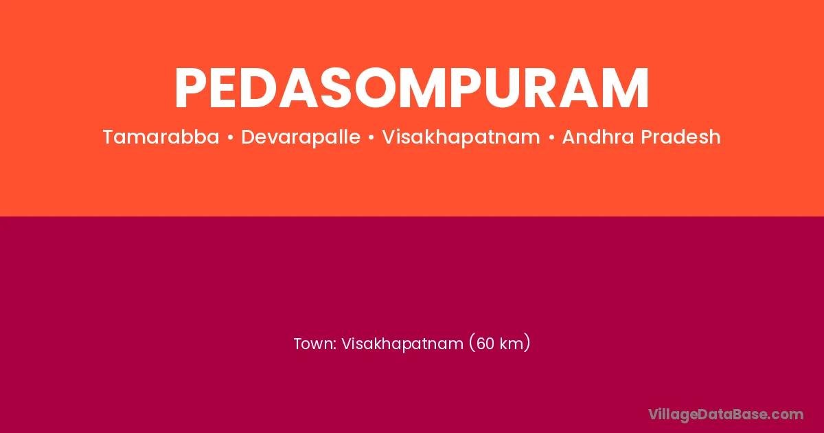 Visakhapatnam (60 km) is the nearest town to Pedasompuram village for major economic activities and is located approximately 60 km away.