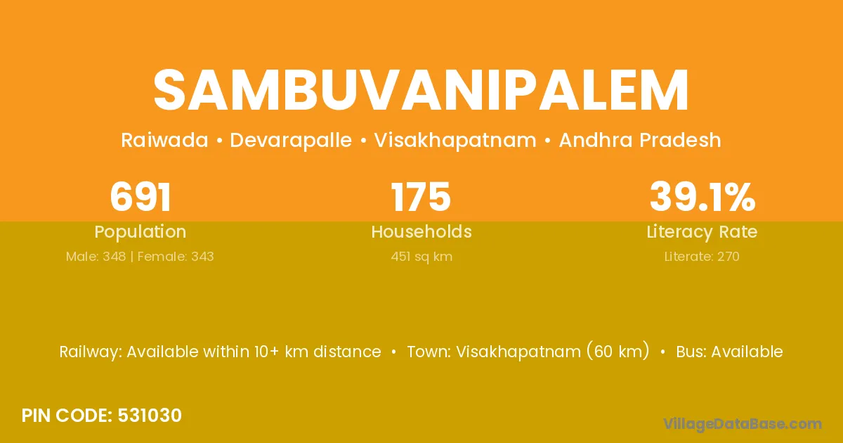 Sambuvanipalem village has a total population of 691 people, of which 348 are males and 343 are females.