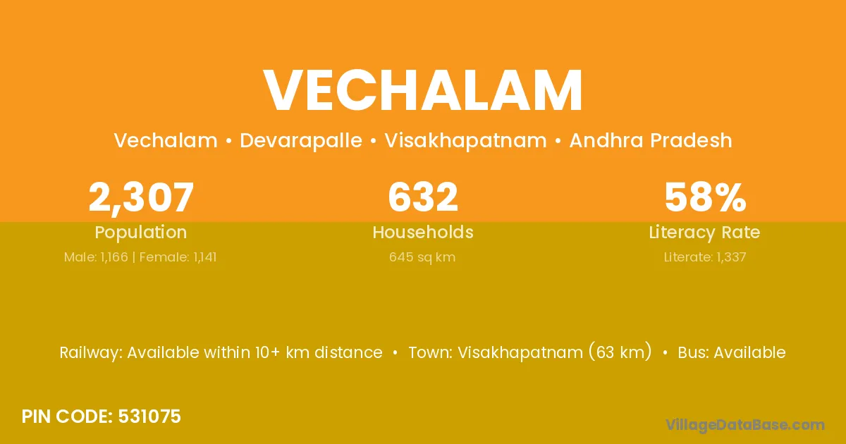 Visakhapatnam (63 km) is the nearest town to Vechalam village for major economic activities and is located approximately 63 km away.