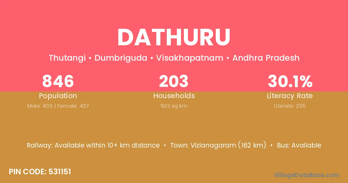 Dathuru village has a total population of 846 people, of which 409 are males and 437 are females.