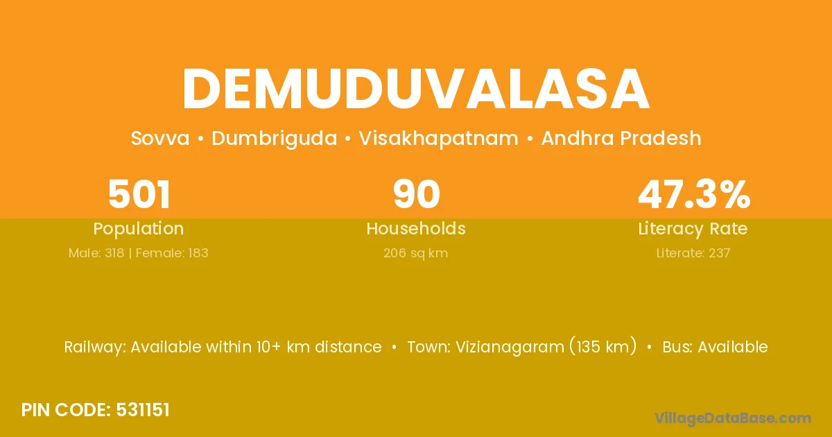 Demuduvalasa village has a total population of 501 people, of which 318 are males and 183 are females.