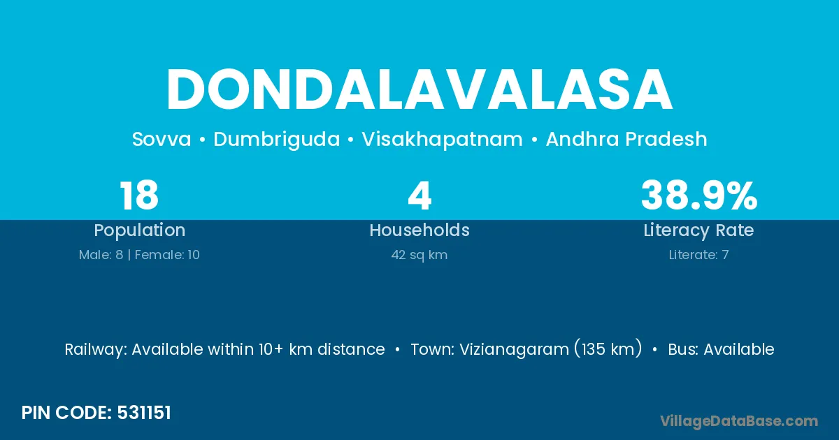 Dondalavalasa village has a total population of 18 people, of which 8 are males and 10 are females.