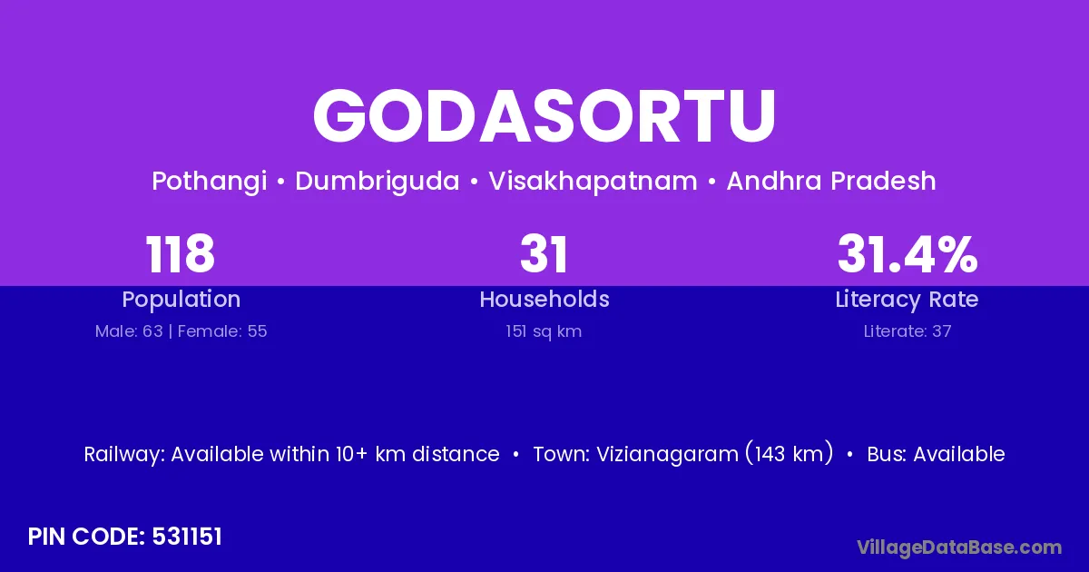 Vizianagaram (143 km) is the nearest town to Godasortu village for major economic activities and is located approximately 143 km away.