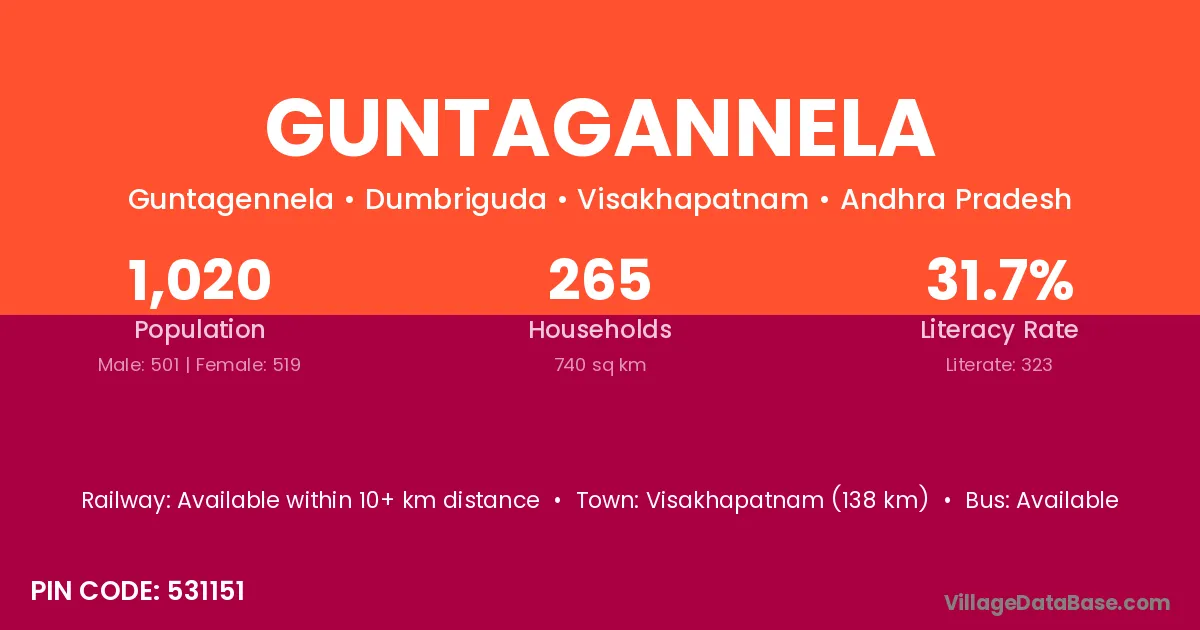 Guntagannela village has a total population of 1,020 people, of which 501 are males and 519 are females.