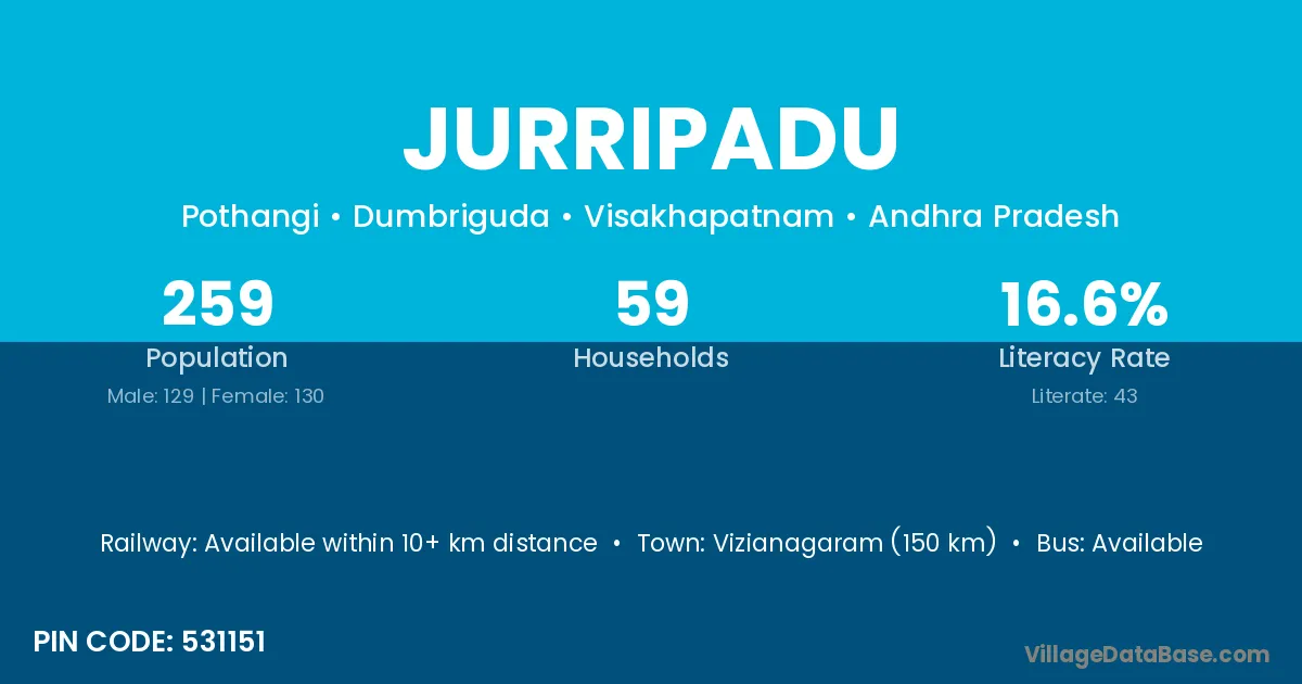Jurripadu village has a total population of 259 people, of which 129 are males and 130 are females.