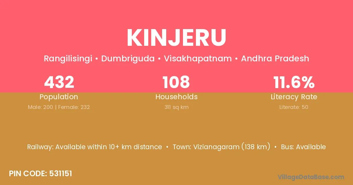 Kinjeru village has a total population of 432 people, of which 200 are males and 232 are females.