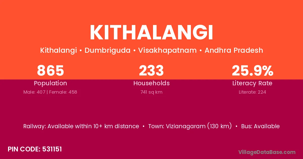 Kithalangi village has a total population of 865 people, of which 407 are males and 458 are females.