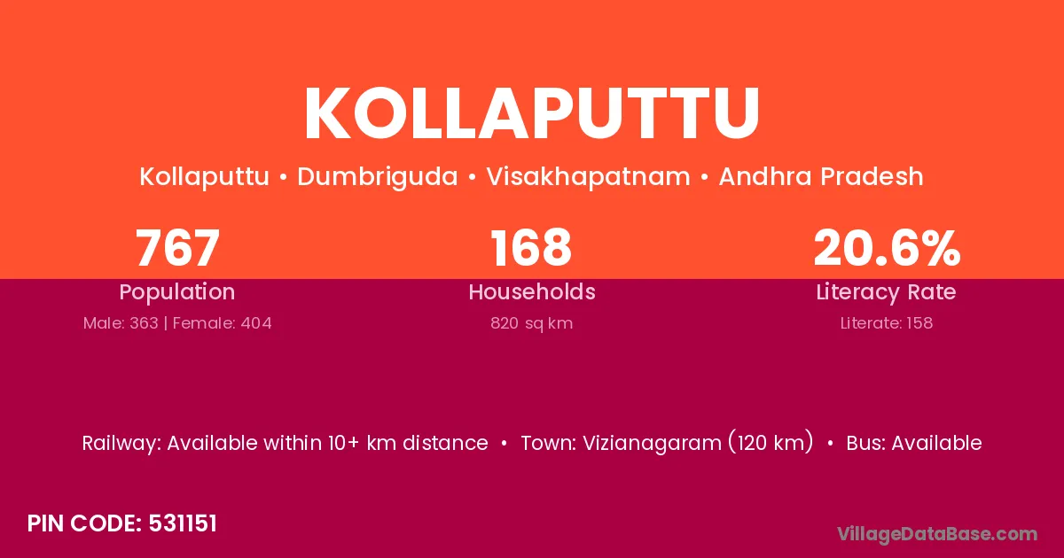 Kollaputtu village has a total population of 767 people, of which 363 are males and 404 are females.