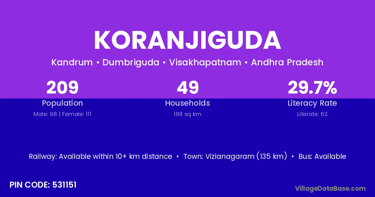 Vizianagaram (135 km) is the nearest town to Koranjiguda village for major economic activities and is located approximately 135 km away.