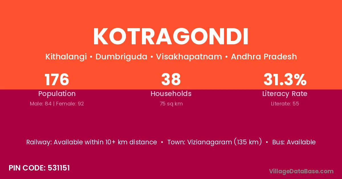 Vizianagaram (135 km) is the nearest town to Kotragondi village for major economic activities and is located approximately 135 km away.