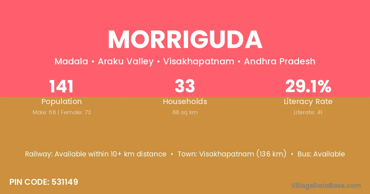 Vizianagaram (138 km) is the nearest town to Morriguda village for major economic activities and is located approximately 138 km away.