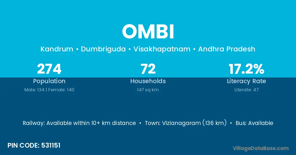 Vizianagaram (136 km) is the nearest town to Ombi village for major economic activities and is located approximately 136 km away.