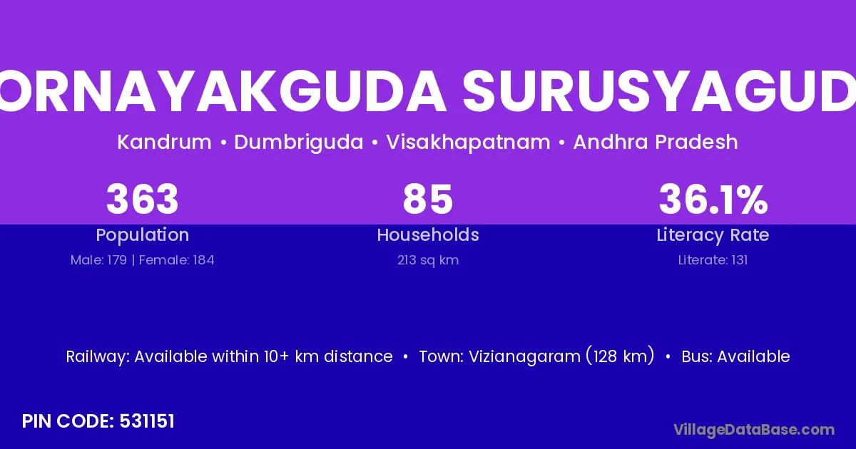 Vizianagaram (128 km) is the nearest town to Sornayakguda Surusyaguda village for major economic activities and is located approximately 128 km away.