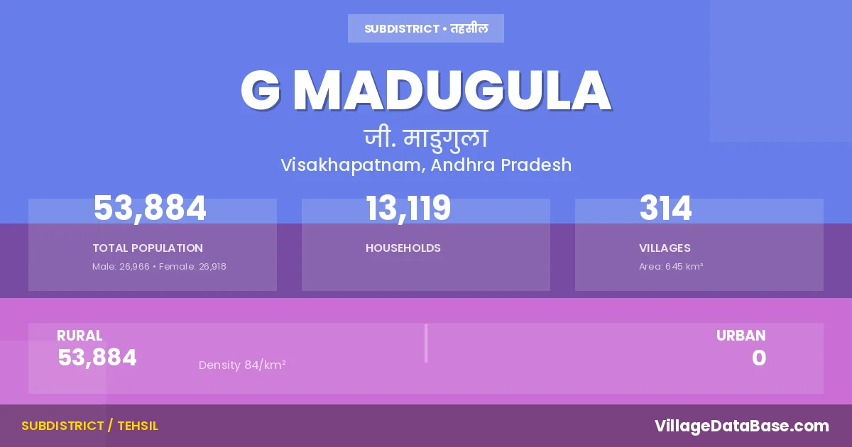 According to the 2011 census The total area of G Madugula Mandal is 645 km², with a population of 53884 people. The population density is 84 inhabitants per square kilometre, and there are approximately 13119 houses in the sub district.