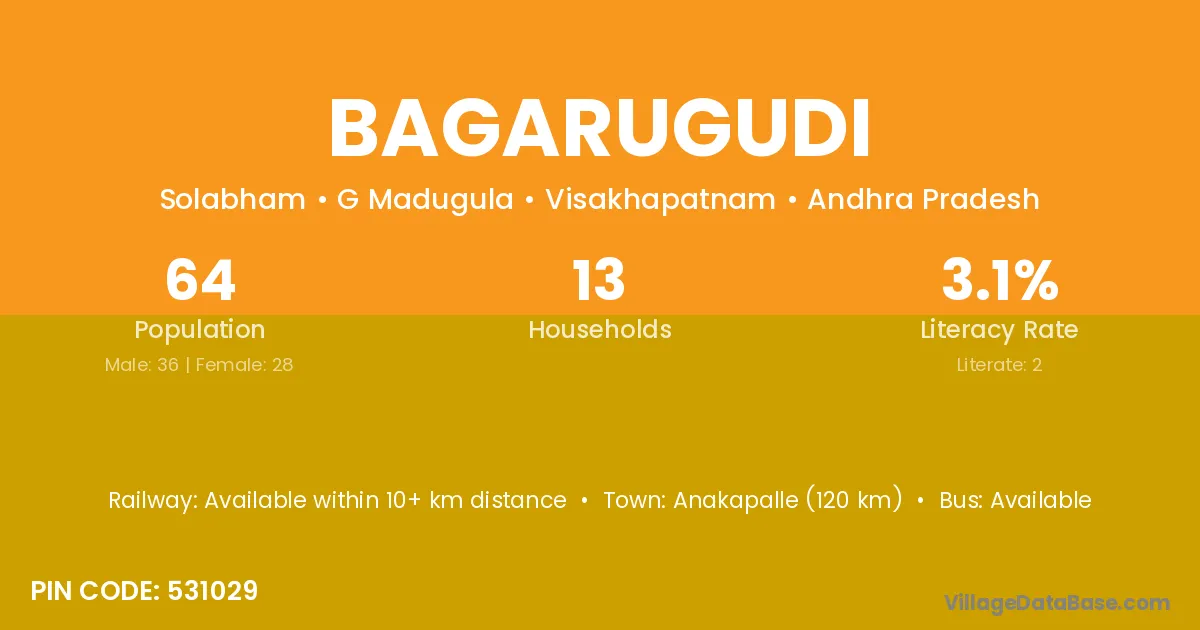 Anakapalle (120 km) is the nearest town to Bagarugudi village for major economic activities and is located approximately 120 km away.
