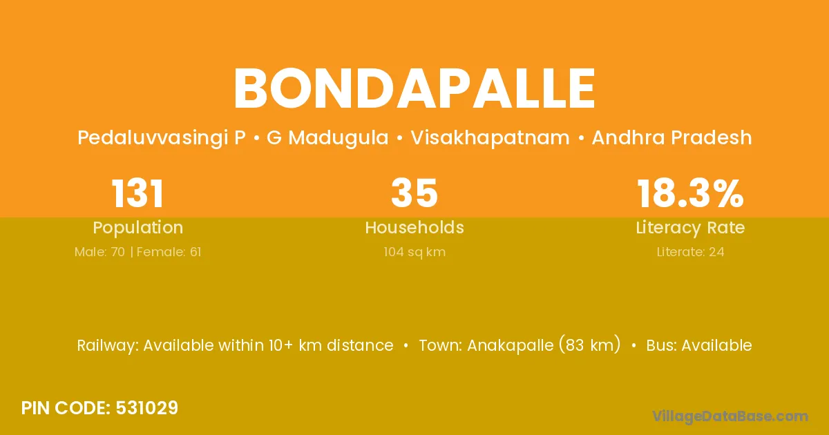 Bondapalle village has a total population of 131 people, of which 70 are males and 61 are females.