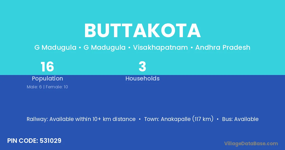 Anakapalle (117 km) is the nearest town to Buttakota village for major economic activities and is located approximately 117 km away.