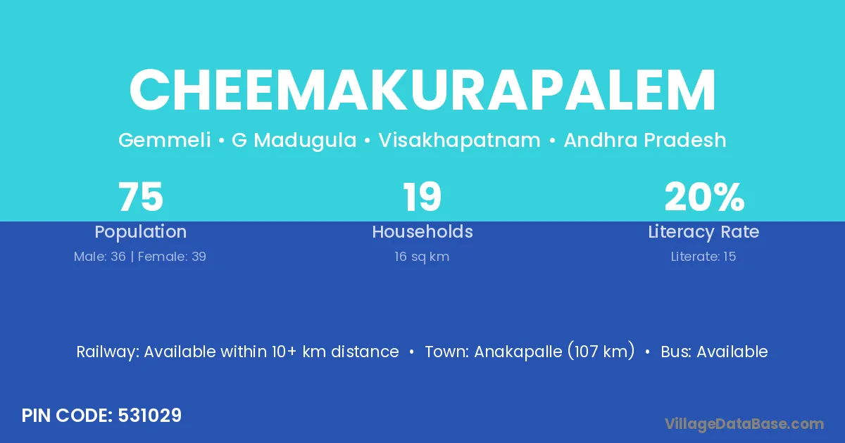 Anakapalle (107 km) is the nearest town to Cheemakurapalem village for major economic activities and is located approximately 107 km away.