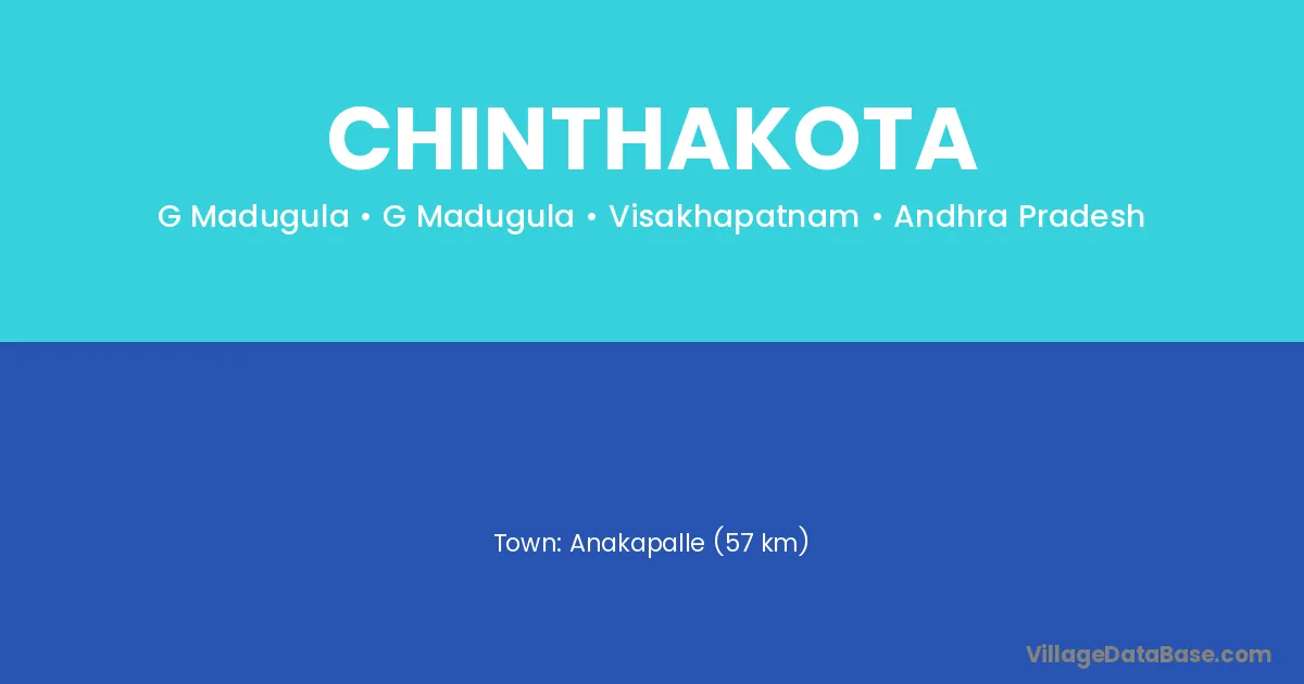 Anakapalle (57 km) is the nearest town to Chinthakota village for major economic activities and is located approximately 57 km away.