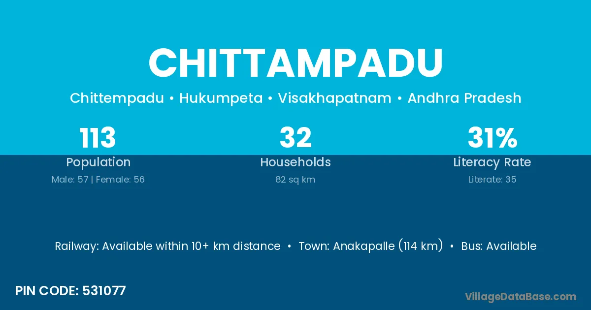 Anakapalle (89 km) is the nearest town to Chittampadu village for major economic activities and is located approximately 89 km away.