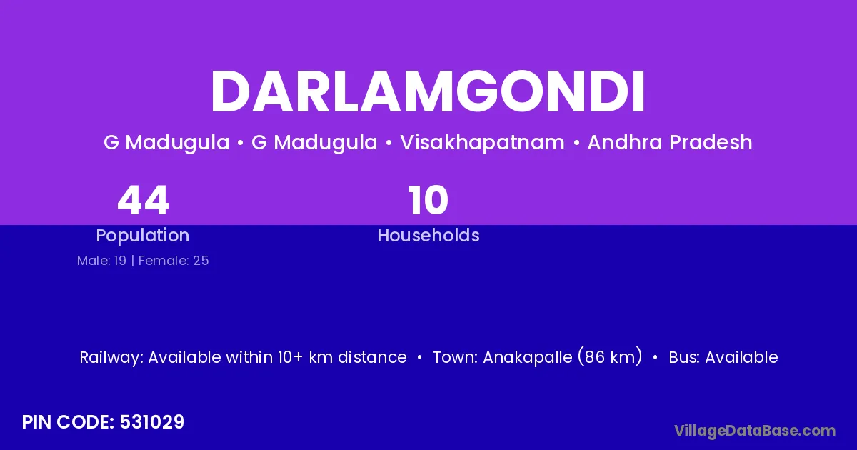 Anakapalle (86 km) is the nearest town to Darlamgondi village for major economic activities and is located approximately 86 km away.