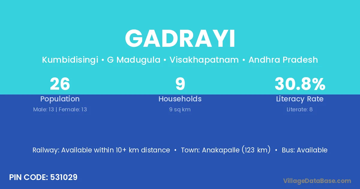 Anakapalle (123 km) is the nearest town to Gadrayi village for major economic activities and is located approximately 123 km away.