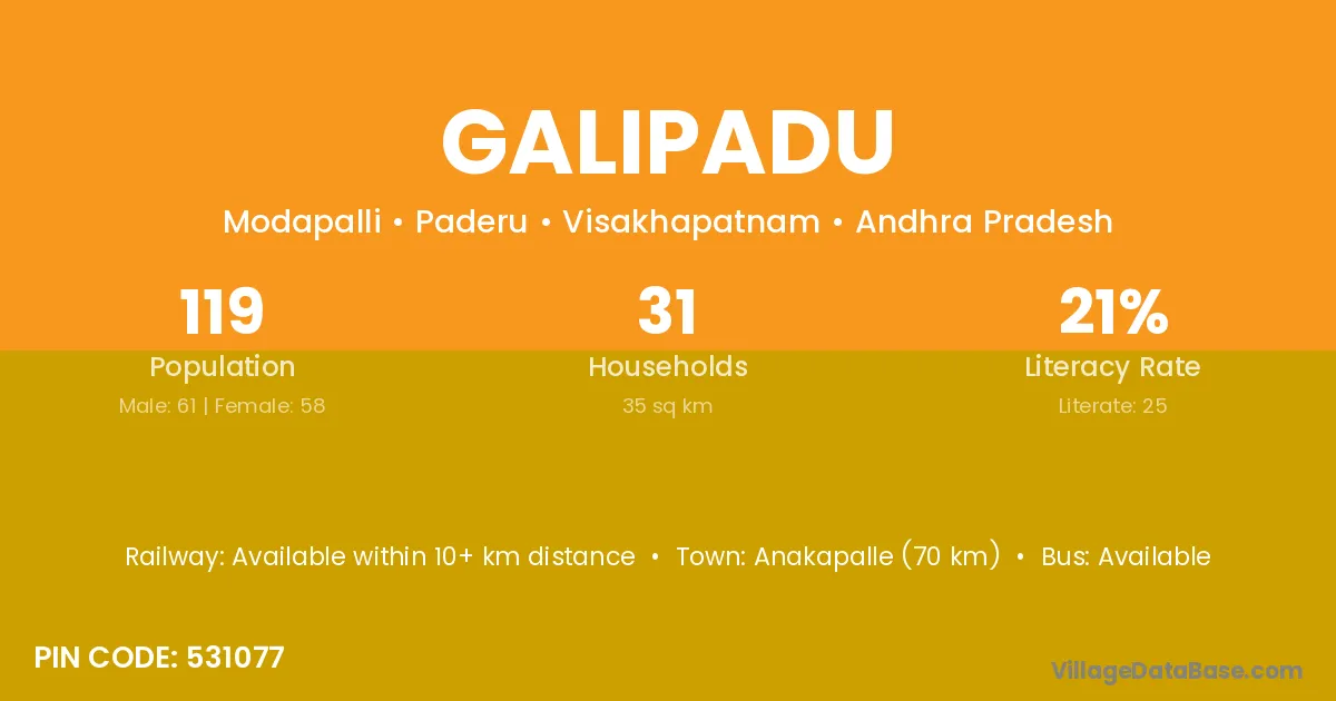 Anakapalle (72 km) is the nearest town to Galipadu village for major economic activities and is located approximately 72 km away.
