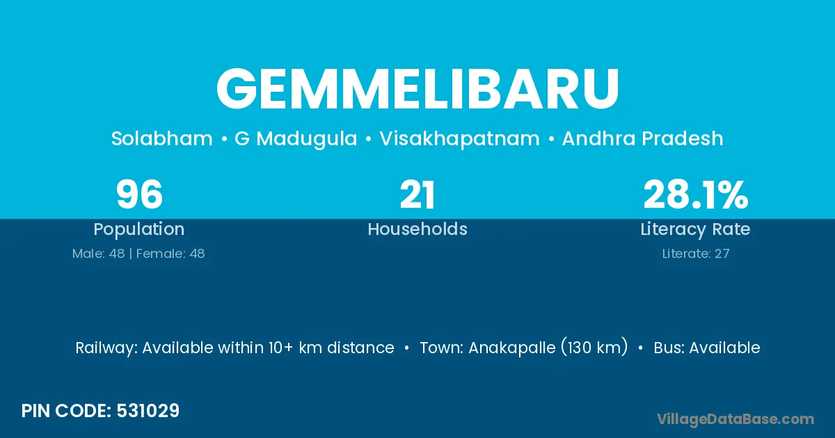 Anakapalle (130 km) is the nearest town to Gemmelibaru village for major economic activities and is located approximately 130 km away.
