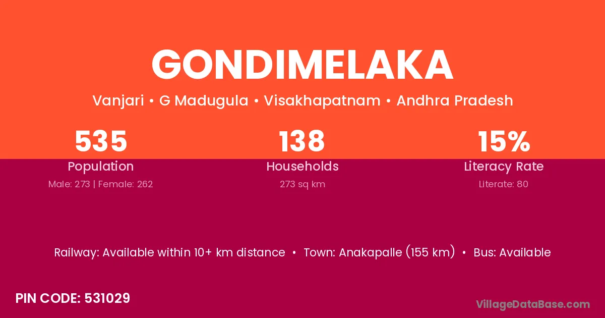Anakapalle (155 km) is the nearest town to Gondimelaka village for major economic activities and is located approximately 155 km away.