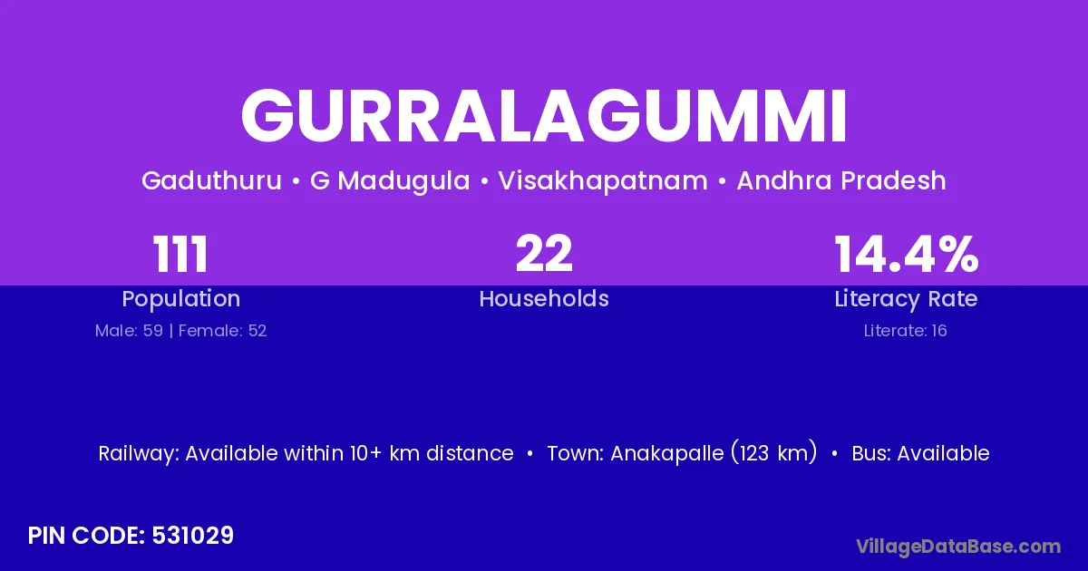 Anakapalle (123 km) is the nearest town to Gurralagummi village for major economic activities and is located approximately 123 km away.