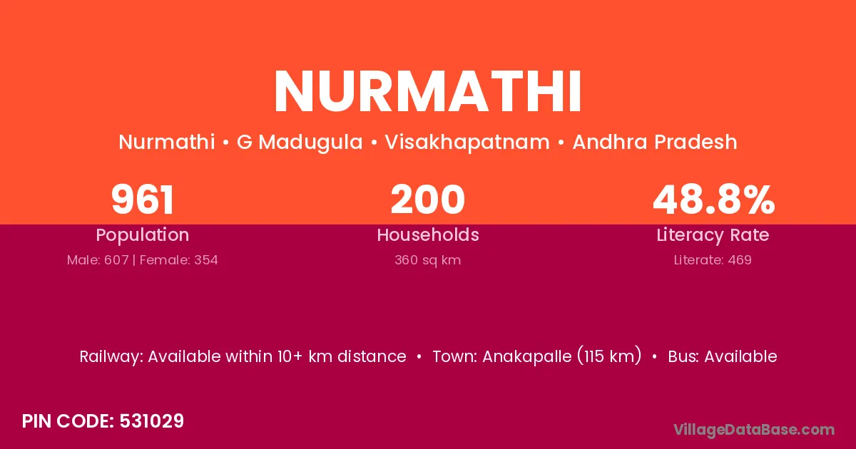 Anakapalle (115 km) is the nearest town to Nurmathi village for major economic activities and is located approximately 115 km away.
